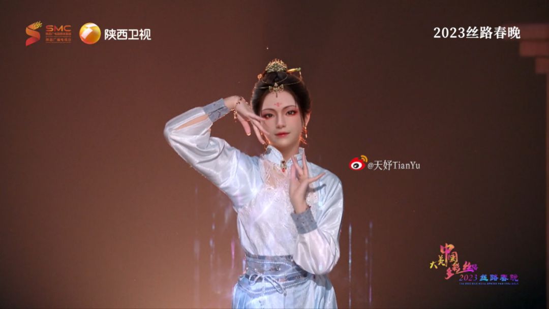 “這青瓷之青,果然國色?!薄拔覍⑷∵@抹青而去,重修壁畫!”伴隨著音樂聲漸漸落下,天妤著一襲海天碧色國風(fēng)服飾,手捧耀州青瓷的形象慢慢定格。大年初一晚,天妤亮相“大美中國·多彩