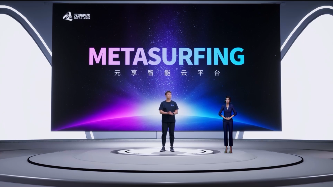 2023年4月12日天娛數(shù)科旗下元境科技舉辦了自研虛擬數(shù)字化智能產(chǎn)品「MetaSurfing-元享智能云平臺」的產(chǎn)品發(fā)布會。此次發(fā)布會利用真人講解+虛擬背景這種虛擬與現(xiàn)實相結(jié)合的方