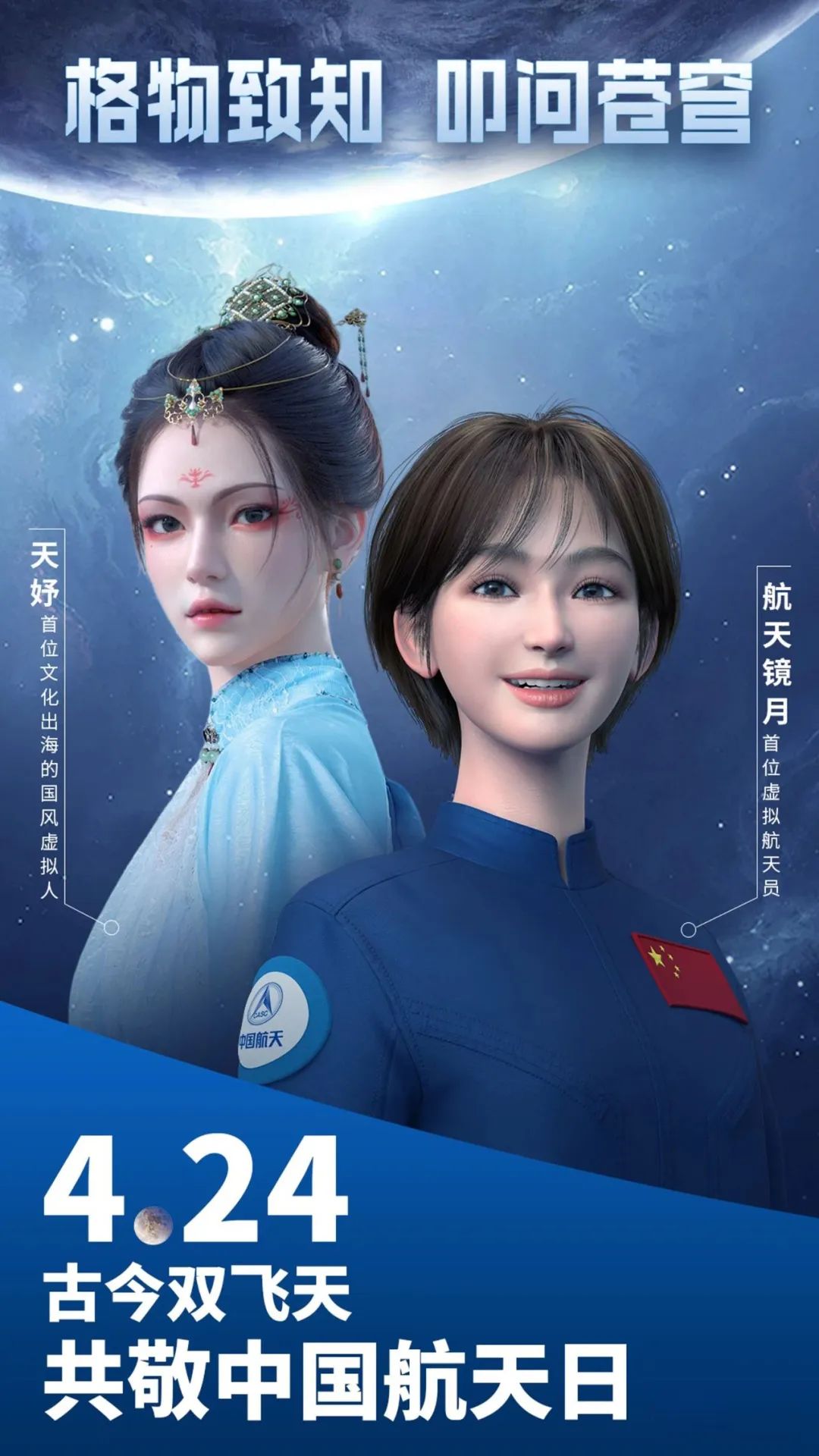 “格物致知,叩問蒼穹”。4月24日,在第八個“中國航天日”來臨之際,天娛數(shù)科旗下虛擬數(shù)字人天妤攜手首位虛擬航天員鏡月發(fā)布雙人主題海報,共同致敬中國航天日。二者以“古今雙飛