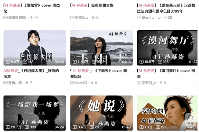 近日,AI“孫燕姿”爆火,其翻唱的《發(fā)如雪》《下雨天》短短幾天就突破百萬播放量,一度登上各大平臺熱搜榜首位,成為“新晉頂流”。在B站在搜索框輸入“AI”后,第一個詞條就是“AI