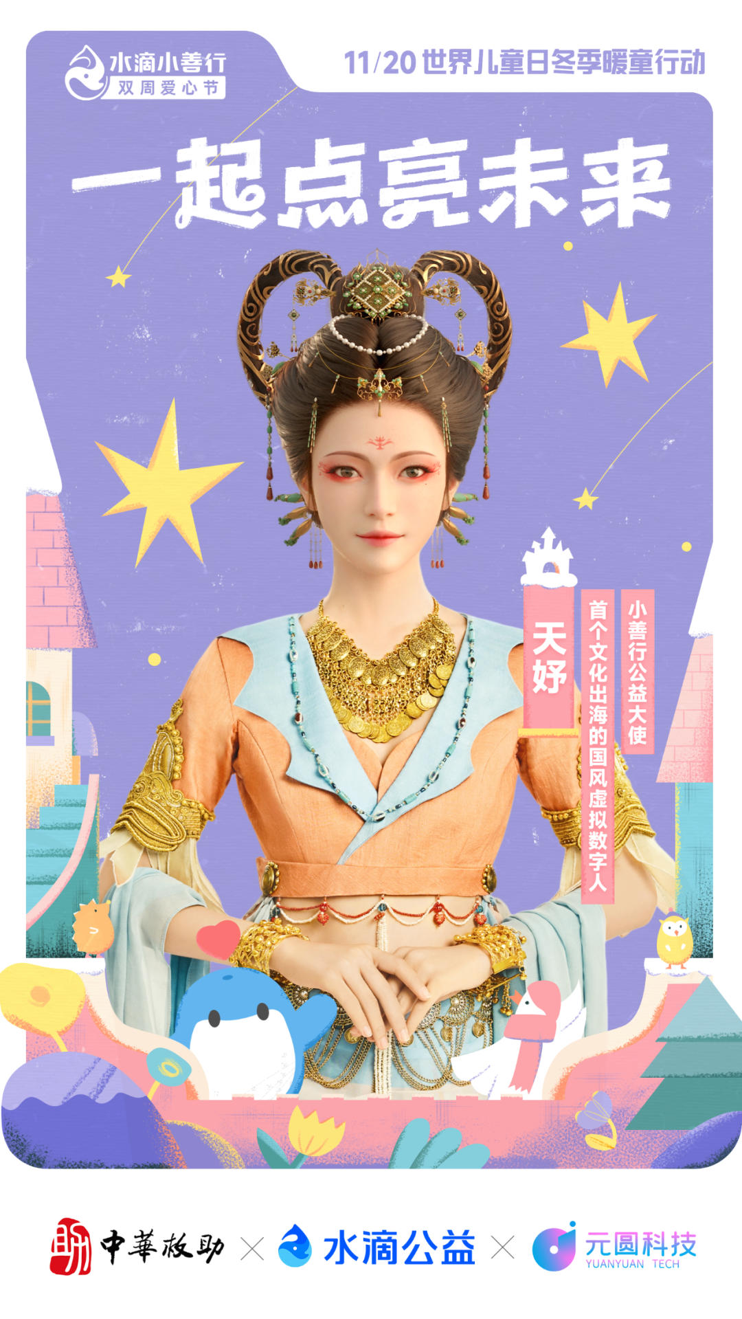 11月20日世界兒童日,天娛數(shù)科旗下國風(fēng)虛擬數(shù)字人天妤官宣擔(dān)任水滴公益“小善行公益大使”,呼吁大家關(guān)注兒童成長,守護(hù)希望之光,用愛和行動溫暖孩子的健康童年?!八涡∩菩小笔?/p>