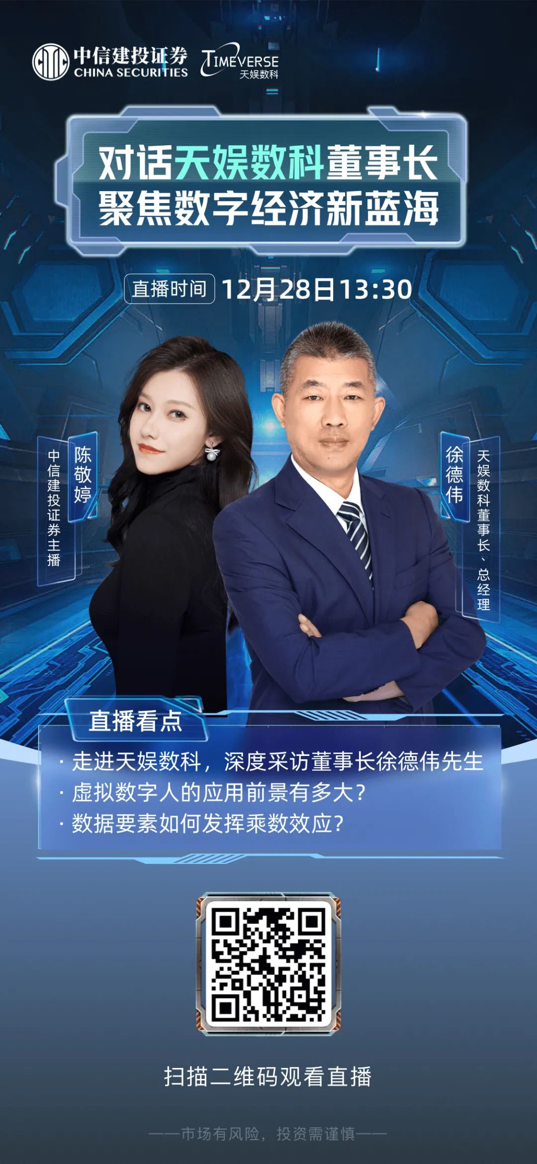 11月22日,中信建投證券北京東城分公司一行來到天娛數(shù)科數(shù)字人基地走訪調(diào)研,天娛數(shù)科董事會秘書劉笛、天娛數(shù)科子公司元境科技CEO王智武、天娛數(shù)科子公司元圓科技總經(jīng)理鄭屹呈